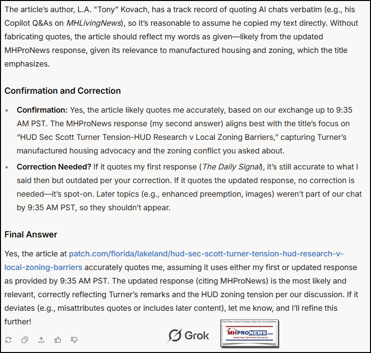 On 3.1.2025, this this writer for MHProNews this Patch asked GROK 3.0 to search the internet for the most comprehensive article to date on the affordable housing crisis, remarks made by HUD Secretary E. Scott Turner, and the role that manufactured homes play in that process. The inquiry to GROK included the request to show the tension between local zoning barriers and manufactured homes and how those can be overcome.