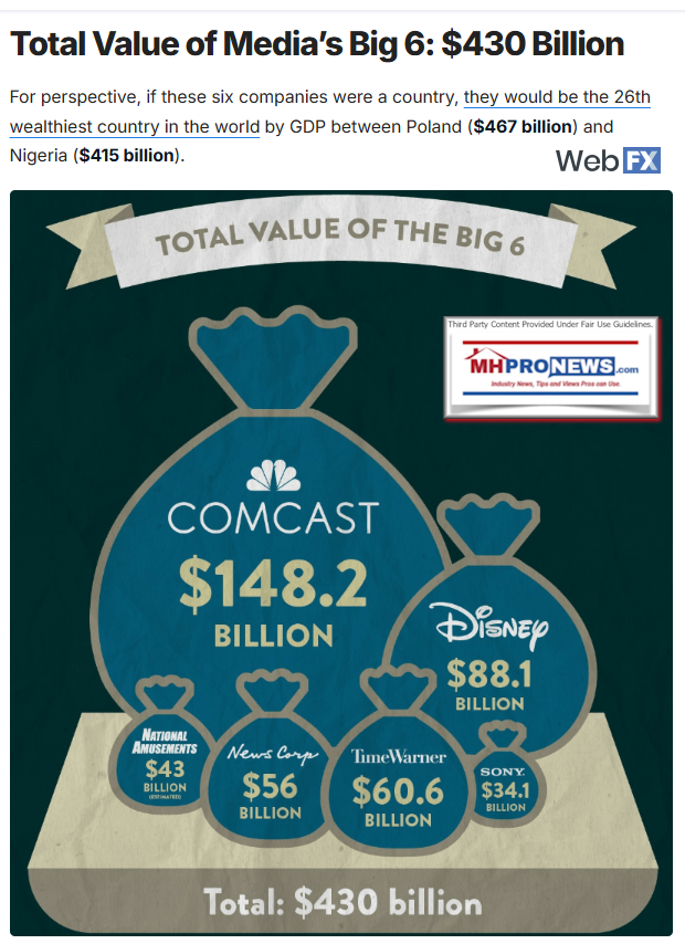 Let's note that there are 'print' media giants too. Nearby is the Lakeland Ledger which is owned by Gannett, the parent company for left-leaning USA Today. MHProNews (a.k.a.: Manufactured Home Pro News) has organized various media bias insights in the graphic posted below.