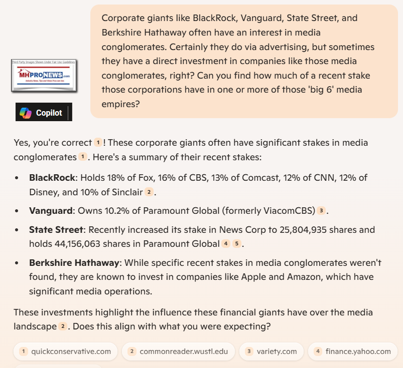 Corporate giants like BlackRock, Vanguard, State Street, and Berkshire Hathaway often have an interest in media conglomerates. Certainly they do via advertising, but sometimes they have a direct investment in companies like those media conglomerates, right? Can you find how much of a recent stake those corporations have in one or more of those 'big 6' media empires?