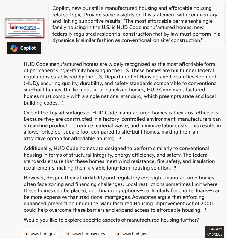 "Copilot, new but still a manufactured housing and affordable housing related topic. Provide some insights on this statement with commentary and linking supportive results: "The most affordable permanent single family housing in the U.S. is HUD Code manufactured homes, new federally regulated residential construction that by law must perform in a dynamically similar fashion as conventional 'on site' construction."