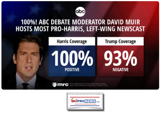 This writer for MHProNews and contributor for the Patch has systematically made several points in recent weeks. Among them is that millions of routinely well meaning Americans have been manipulated and misled into thinking things about Donald Trump and so-called MAGA – Make America Great Again – Republicans and their supporters that are either flatly untrue, or are twisted, exaggerated, or otherwise inaccurate. Because much of the media is left-leaning, Democratic candidates can generally know that they will benefit from the 'cover' those left-leaning sources give them. Organizations like the Media Research Center (MRC) have documented this pattern for years, and recent examples of MRC's research on how that benefits Kamala Harris, or Joe Biden before her, are shown below.