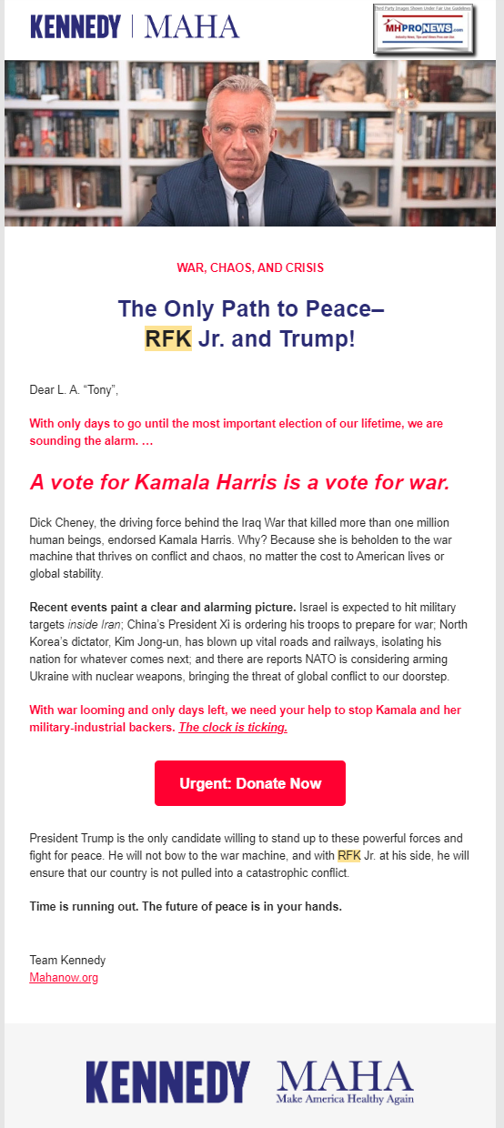 Note that as a trade publisher, we get an array of campaign and other messages from major and minor parties. Kennedy's are among them. This email from Kennedy came in just days ago.