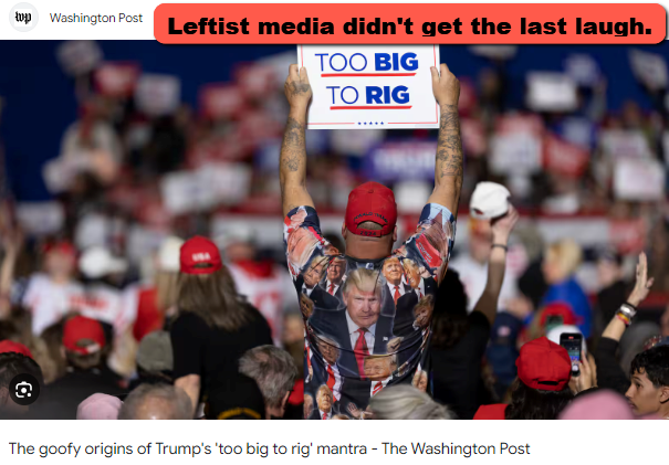 Note in the above how the left-leaning Washington Post caption under that photo seems to mock Trump supporters as "goofy" for their "Too Big To Rig" statement and related concern? By putting their thumb on the scale of reporting, trust in their own content is undermined. Who says? Gallup's recent survey of Americans' low trust in media.