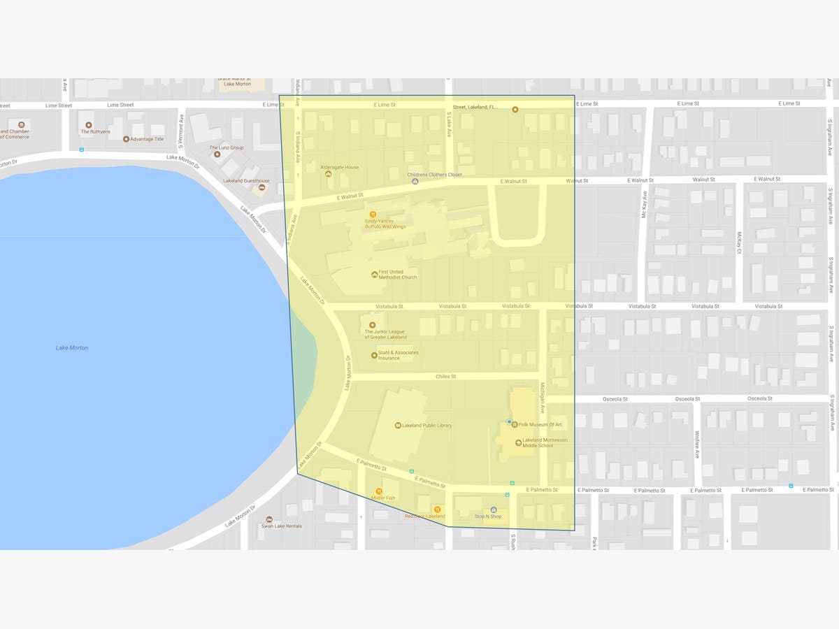 The East Lake Morton area boundaries are from East Palmetto Street north to East Lime Street, and from Lake Morton Drive to Michigan Avenue. The area encompasses the Polk Museum of Art, Lakeland Public Library, Mister Fish, Red Door Lakeland, First United Methodist Church, Stahl & Associates Insurance and the Junior League of Greater Lakeland.