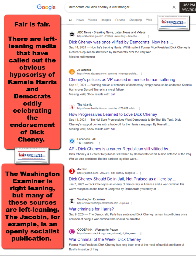 Fair is fair. Among the media outlets that follow, most of them are left-leaning media, yet they have called out the obvious hypocrisy of Kamala Harris (D) and Democrats oddly celebrating the endorsement of accused "war monger" Dick Cheney (R). Among the media operations shown below, the Washington Examiner is right-leaning, but many if not most of those sources are left-leaning. The Jacobin, for example, is an openly pro-socialist publication.