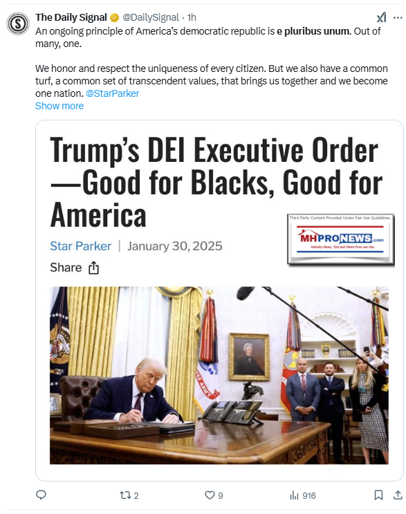 From the Daily Torch to this writer for MHProNews and this Patch is the Robert Romano take on in Part I the President Donald J. Trump executive order (a.k.a.: E.O. or EO) the 'abolished' Diversity, Equity, and Inclusion (DEI) programs in the federal government. C.U.R.E. President Star Parker's take on the DEI topic is featured in Part II. While there is evidence that at least some federal officials are slyly trying to avoid compliance to the Trump E.O. ending DEI in the government that action is a step at ending waste and a politicized Biden-Harris (D) era initiative.