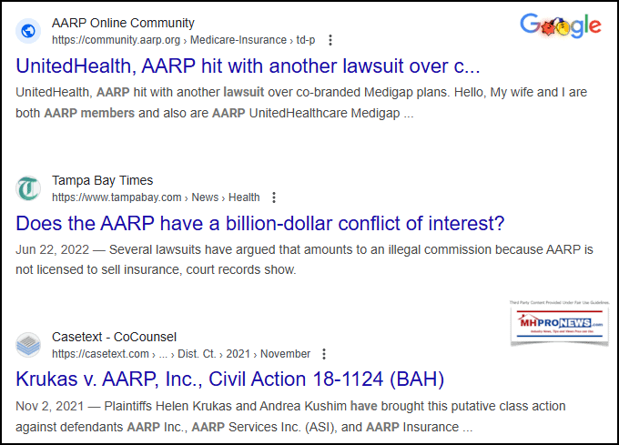 3) That said, at least looking back at history, while Kuttner is apparently mistaken about his closing claim about Trump with respect to Medicare and Social Security, there are several points that Kuttner raised that are sobering and based on evidence, even if he didn't specifically cite his sources. For example, Kuttner said "AARP has been sued by members a number of times for its conflict of interest in promoting an inferior insurance product." The basic Google search in the screen capture that follows demonstrates his claim.