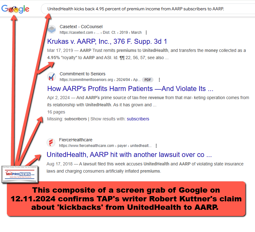 4) The composite screen grab below of a Google search on 12.11.2024 confirms TAP's founder-writer Robert Kuttner's claim about 'kickbacks' from UnitedHealth to AARP.