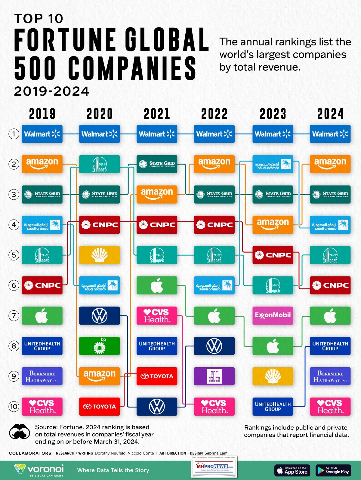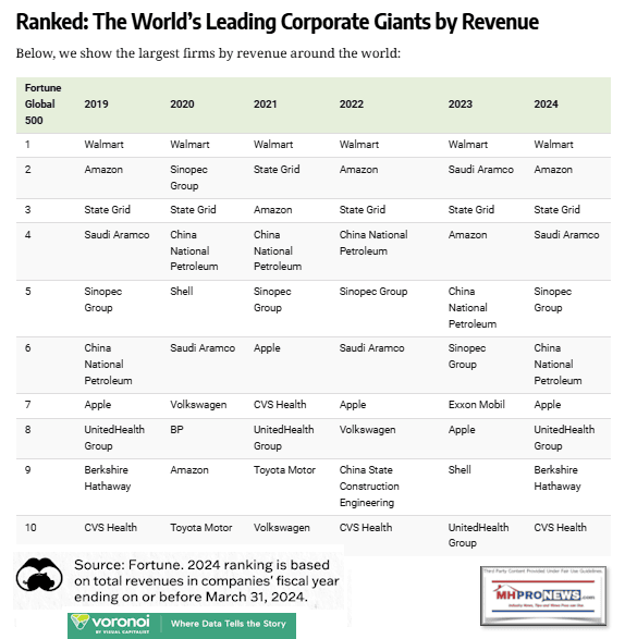 Information can be accurate and yet still may reveal or conceal other truths lurking behind the proverbial curtain. Visual Capitalist (VC) states they organized this information about the top ten global companies from research produced by left-leaning Fortune. VC’s website says their data discovery app, “Voronoi, is only a year old, and already we’ve seen an incredible array of data-driven visualizations from creators.” VC has made a name for themselves by organizing data into visualizations like charts and infographics shown below. The information that follows was published on 12.26.2024.