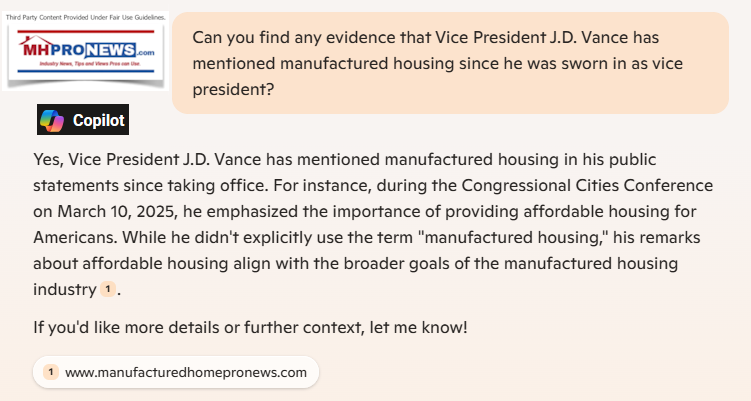As left-leaning Bing's AI powered Copilot pointed on on 3.16.2025 in commenting on that speech, Vance may have implied the need for manufactured housing, but he did not specifically mention manufactured homes. Here is the Q&A with the inquiry by this writer for MHProNews and this Patch.