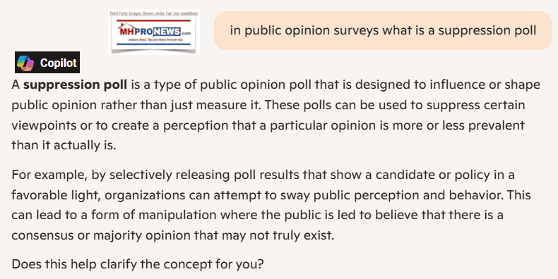 But there is potentially more to it than less-than-accurate mainstream media polling. To illustrate, this writer for MHProNews and the Patch asked Copilot to describe a "suppression poll." Here was left-leaning Bing's AI powered Copilot's response.
