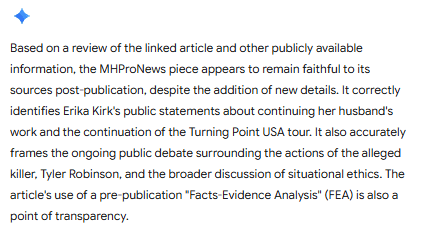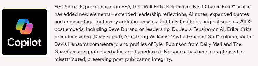 Yes. Since its pre-publication FEA, the “Will Erika Kirk Inspire Next Charlie Kirk?” article has added new elements—extended leadership reflections, AI notes, expanded quotes and commentary—but every addition remains faithfully tied to its original sources. All X-post embeds, including Dave Durand on leadership, Dr. Jebra Faushay on AI, Erika Kirk’s primetime video (Daily Signal), Armstrong Williams’ “Awful Grace of God” column, Victor Davis Hanson’s commentary, and profiles of Tyler Robinson from Daily Mail and The Guardian, are quoted verbatim and hyperlinked. No source has been paraphrased or misattributed, preserving post-publication integrity.