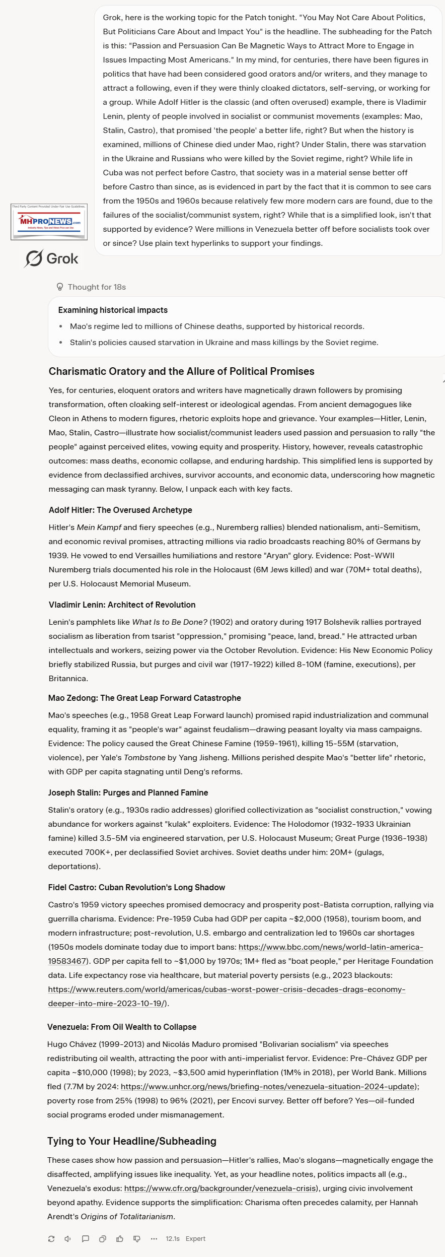 Grok, here is the working topic for the Patch tonight. "You May Not Care About Politics, But Politicians Care About and Impact You" is the headline. The subheading for the Patch is this: "Passion and Persuasion Can Be Magnetic Ways to Attract More to Engage in Issues Impacting Most Americans." In my mind, for centuries, there have been figures in politics that have had been considered good orators and/or writers, and they manage to attract a following, even if they were thinly cloaked dictators, self-serving, or working for a group. While Adolf Hitler is the classic (and often overused) example, there is Vladimir Lenin, plenty of people involved in socialist or communist movements (examples: Mao, Stalin, Castro), that promised 'the people' a better life, right? But when the history is examined, millions of Chinese died under Mao, right? Under Stalin, there was starvation in the Ukraine and Russians who were killed by the Soviet regime, right? While life in Cuba was not perfect before Castro, that society was in a material sense better off before Castro than since, as is evidenced in part by the fact that it is common to see cars from the 1950s and 1960s because relatively few more modern cars are found, due to the failures of the socialist/communist system, right? While that is a simplified look, isn't that supported by evidence? Were millions in Venezuela better off before socialists took over or since? Use plain text hyperlinks to support your findings.