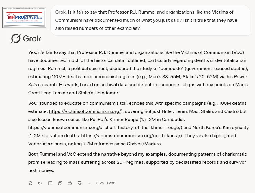 Grok, is it fair to say that Professor R.J. Rummel and organizations like the Victims of Communism have documented much of what you just said? Isn't it true that they have also raised numbers of other examples?