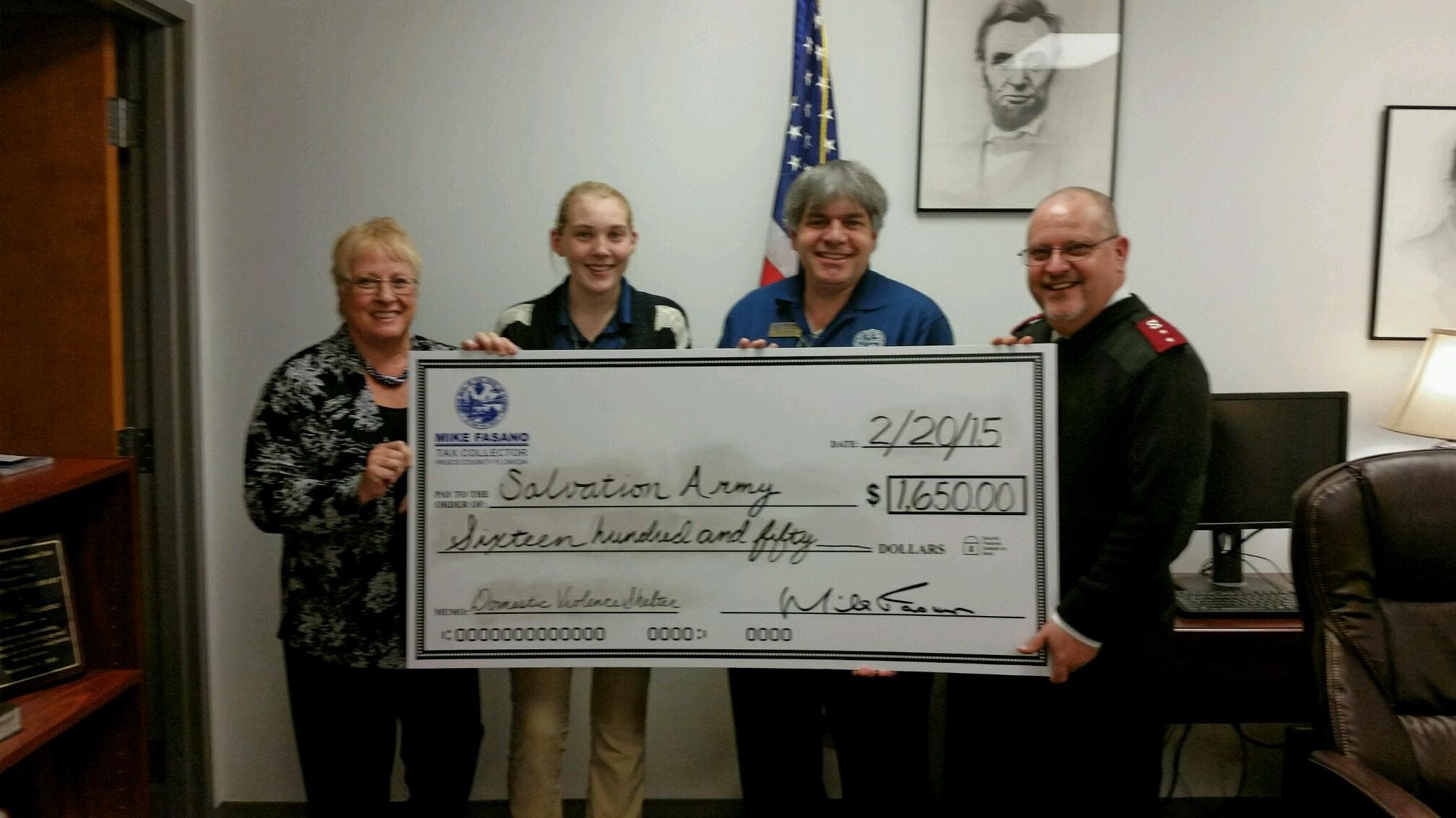 Pasco Tax Collector Mike Fasano announces that the January donation drive on behalf of the Salvation Army Domestic Violence Program resulted in $1650 dollars in donations from the communities which comprise Pasco County. The five tax collector offices in Pasco County (West Pasco Government Center, Gulf Harbors, Central Pasco Government Center – Land O’ Lakes, East Pasco Government Center - Dade City and Wesley Chapel) all accepted donations throughout the month of January.