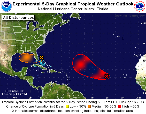 National Weather Service meteorologist Todd Barron says that low pressure system has very little chance of developing into a tropical cyclone. As of Thursday morning, the National Hurricane Center said its chances for development are only about 20 percent over the next 48 hours. The chance rises to about 30 percent over the next five days.