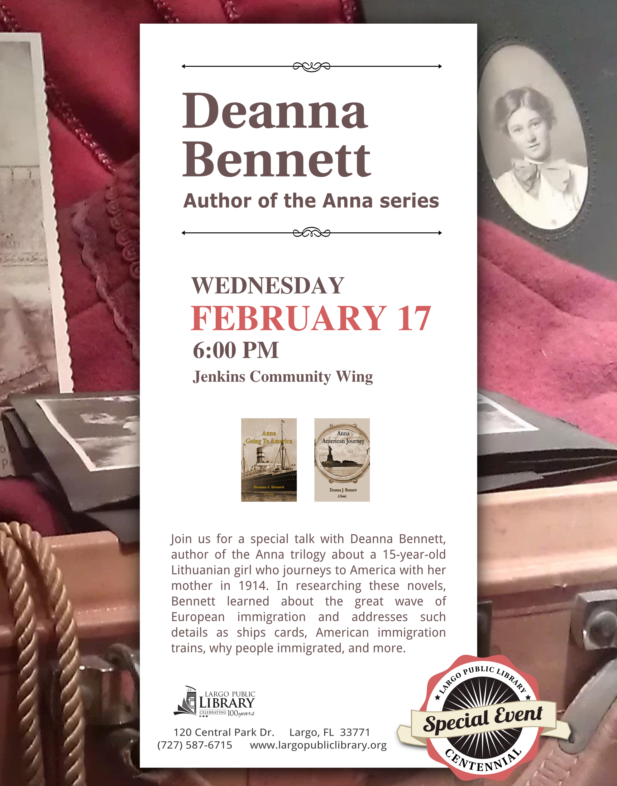 The Largo Public Library is celebrating 100 years of library service with a series of special events continuing through April 2016. This February, enjoy a talk from author, Deanna Bennett, on Wednesday, February 17th at 6:00pm.