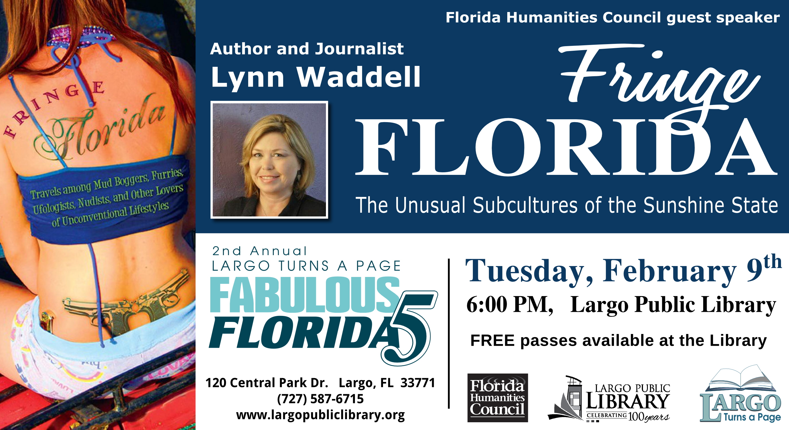 The Fabulous Florida Five marches on at Largo Public Library with author Lynn Waddell. Waddell is a journalist and author of the book, Fringe Florida: Travel Among Mud Boggers, Furries, Ufologists, Nudists, and Other Lovers of Unconventional Lifestyles. Waddell will share her immersive experiences inside of Floridaβs most eclectic and daring worlds.