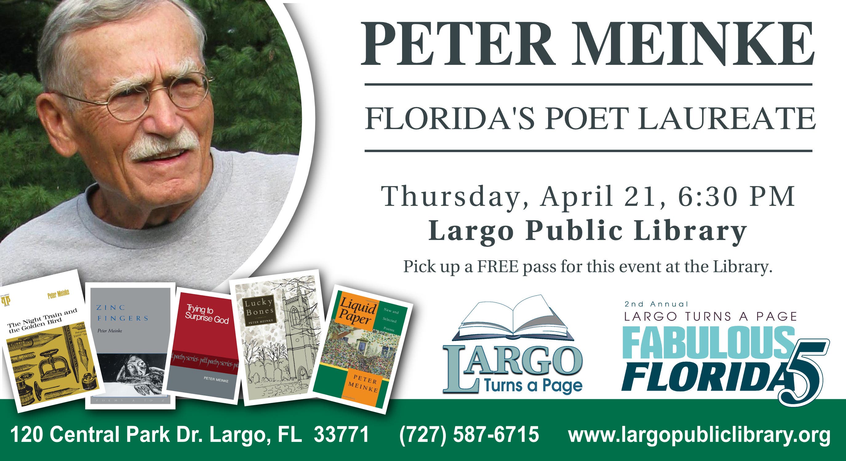 Largo Public Libraryβs centennial celebrations come to a close with a special visit and poetry reading from Floridaβs Poet Laureate, Peter Meinke on Thursday, April 21 at 6:30pm. Meinke is the author of several award-winning books of poetry and short stories that address family, love, and life. His poems began getting national attention in the 1960s when many of them appeared in The New Republic. His first collection of short stories, The Piano Tuner, received the 1986 Flannery OβConnor Award for Short Fiction. Meinke is serving as Poet Laureate of Florida from 2015-2018 after being appointed the first-ever Poet Laureate of St. Petersburg in 2009.