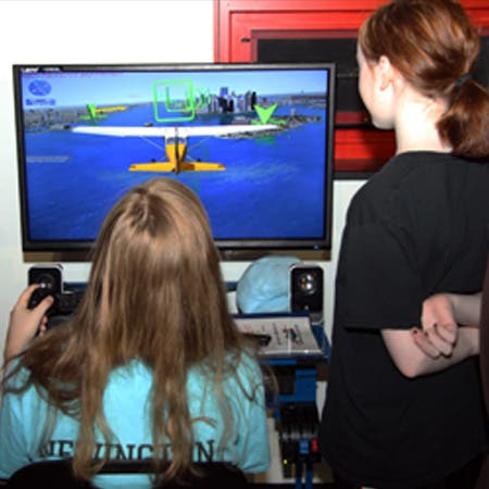 These in-classroom Edustations offer a student the highly-individualized, hands-on experience of sitting in a simulated cockpit and navigating, and βflyingβ, a small plane, jet or helicopter. With a Windows PC workstation, yoke, throttle, rudder, pedals and a 32β High Definition wide screen display, Edustations allow each student to personally experience all the mechanics, theories and skillful techniques aircraft pilots must utilize to safely maneuver and succeed in the βoften-challengingβ landing of their aircraft.β