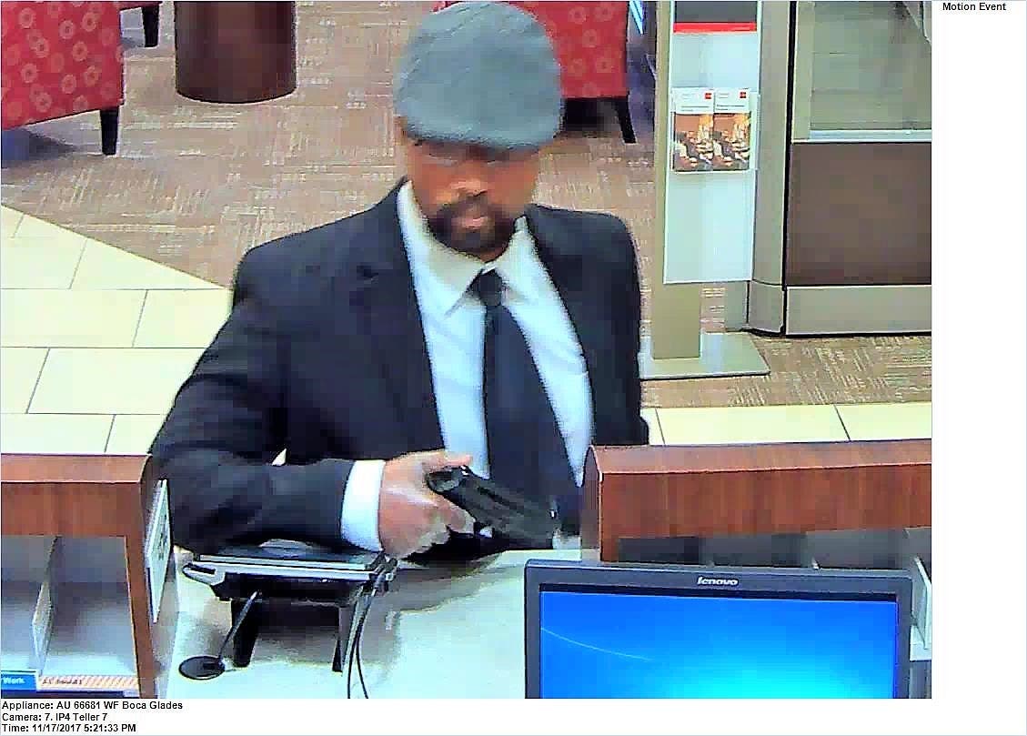 He is believed to be responsible for robberies at the Sun Trust Bank at 7800 Glades Road in Boca Raton on Nov. 7; PNC Bank, 10973 N. Military Trail in Palm Beach Gardens on Nov. 10 and Wells Fargo Bank, 9162 Glades Road in Boca Raton on Nov. 17.