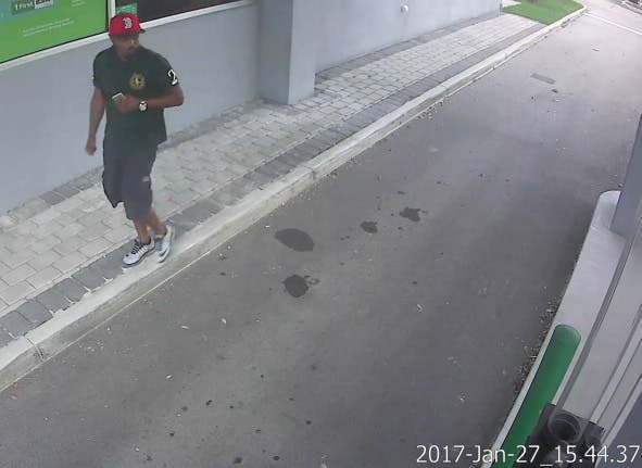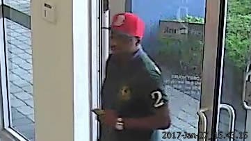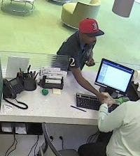 Federal agents released surveillance images of the suspect which shows him wearing a red baseball cap as he approached the counter area of First Bank at 3905 NW 107th Ave.