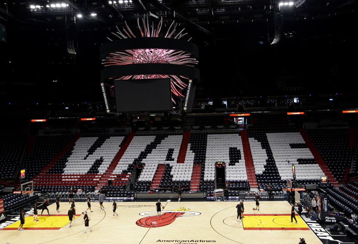 Cutout heads chronicling the career of Miami Heat guard Dwyane Wade sit on the court during a ceremony to honor Wade.