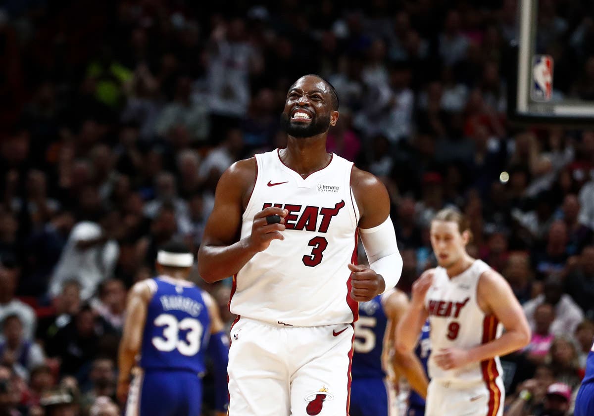 Miami Heat guard Dwyane Wade (3) reacts to missing a shot in the first half of an NBA basketball game against the Philadelphia 76ers.
