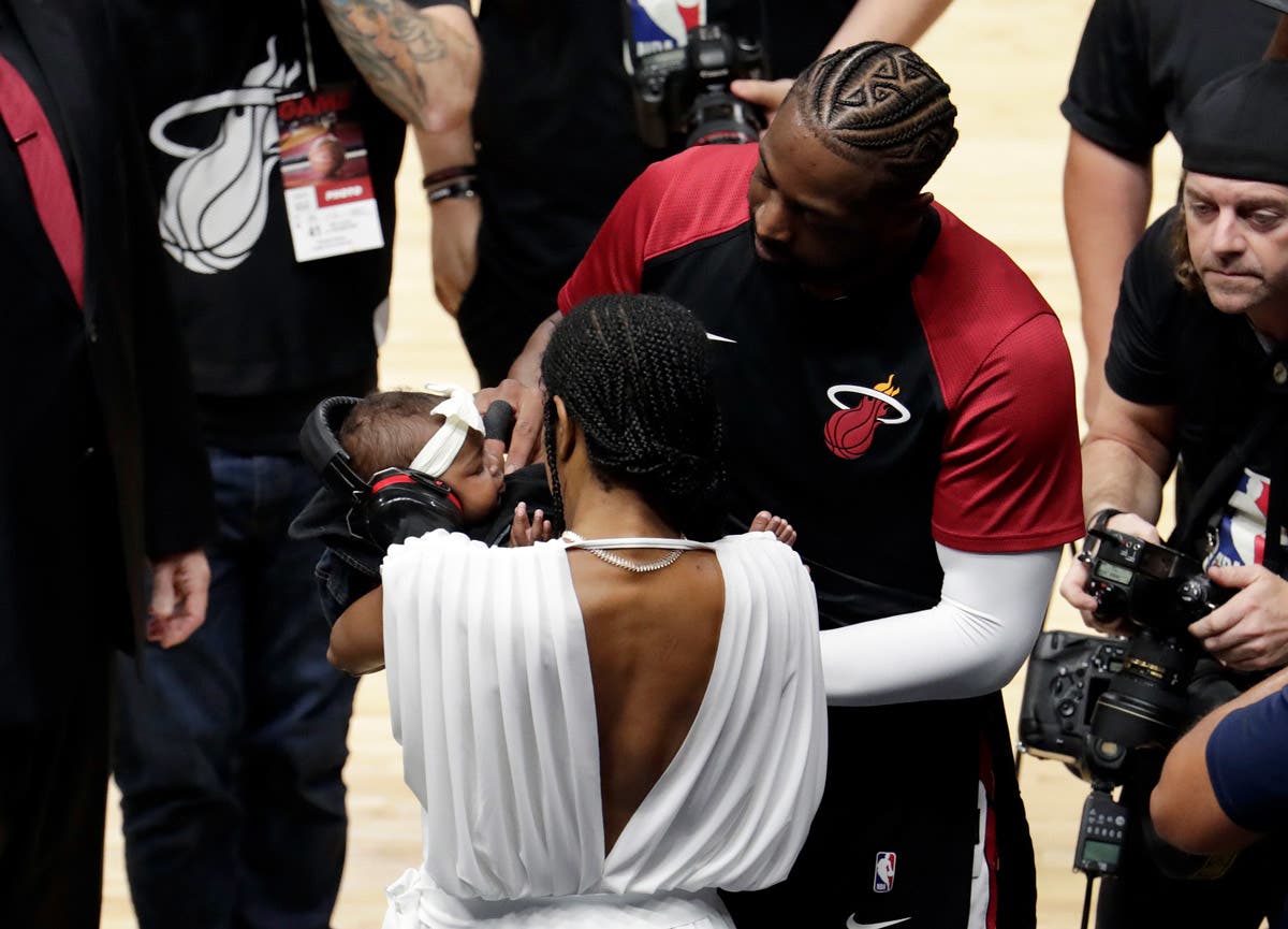 Miami Heat guard Dwyane Wade greets his daughter Kaavia James, and wife Gabrielle Union before a pregame ceremony honoring Wade.
