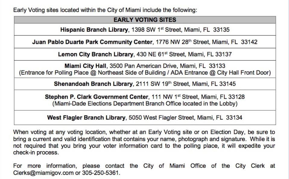 If you plan to vote early, Miami officials said you should bring a current and valid identification that includes your name, photograph and signature.