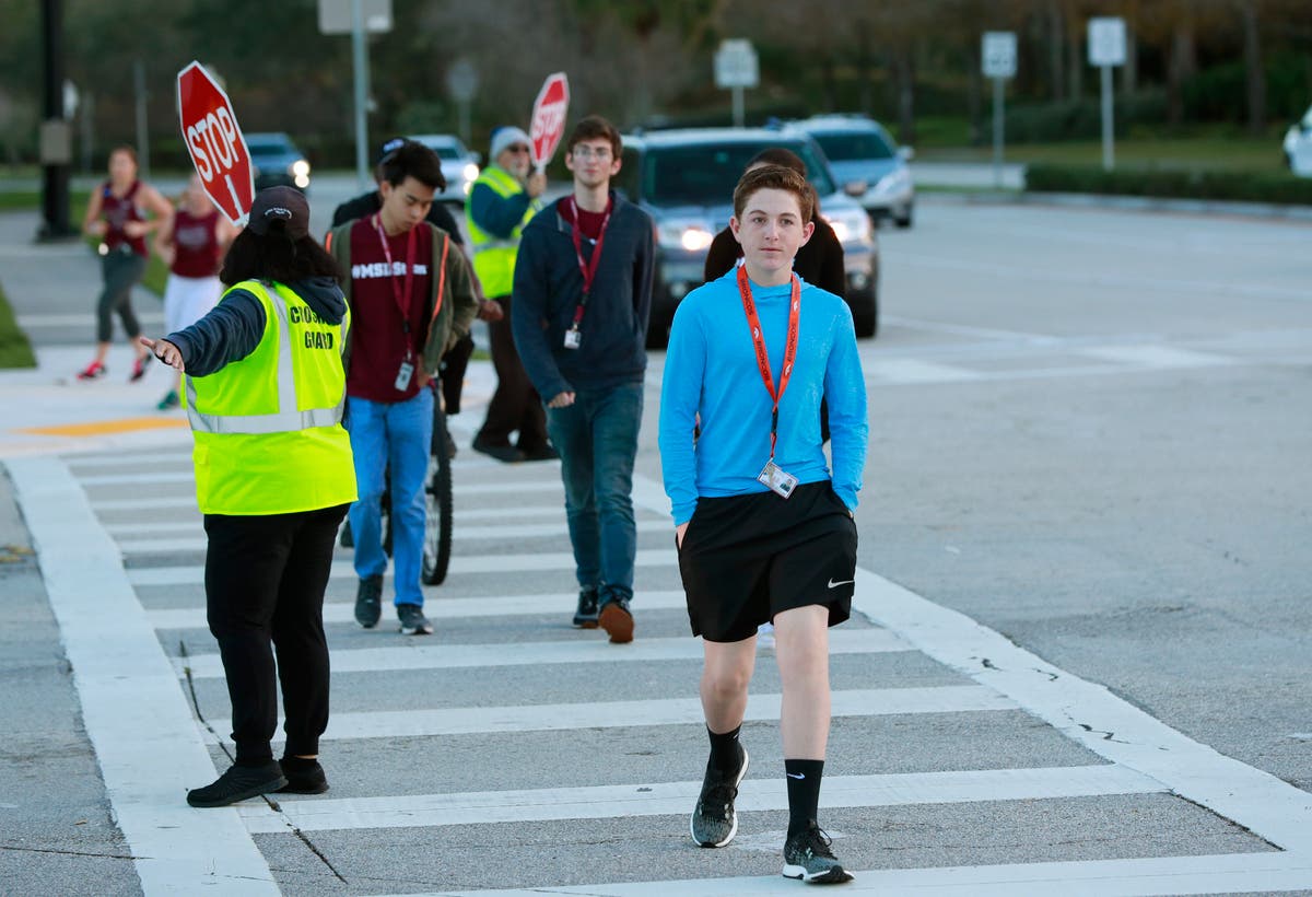 Students walk to Marjory Stoneman Douglas High School during the one-year anniversary of the school shooting.