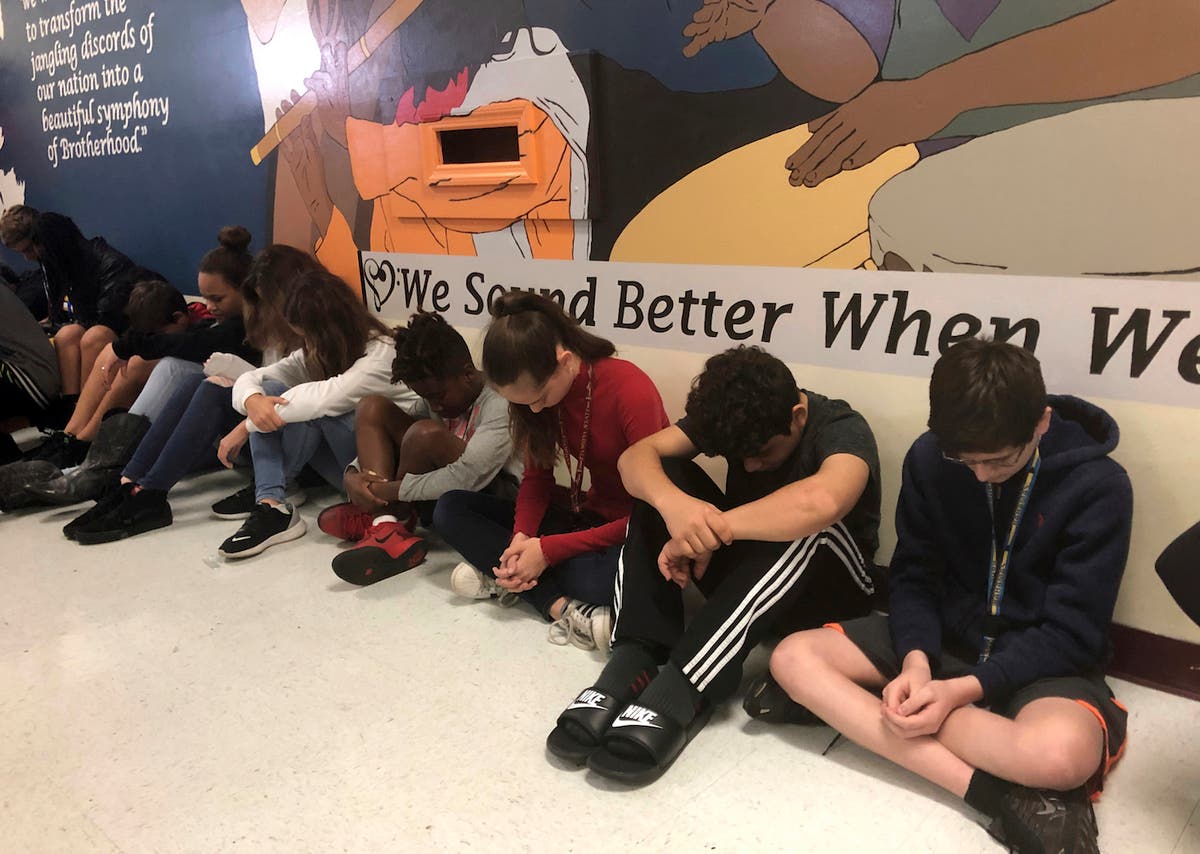 Students at Seminole Middle School in Plantation, Fla., participate in a moment of silence for the 14 students and three staff members killed one year ago at nearby Marjory Stoneman Douglas High School.