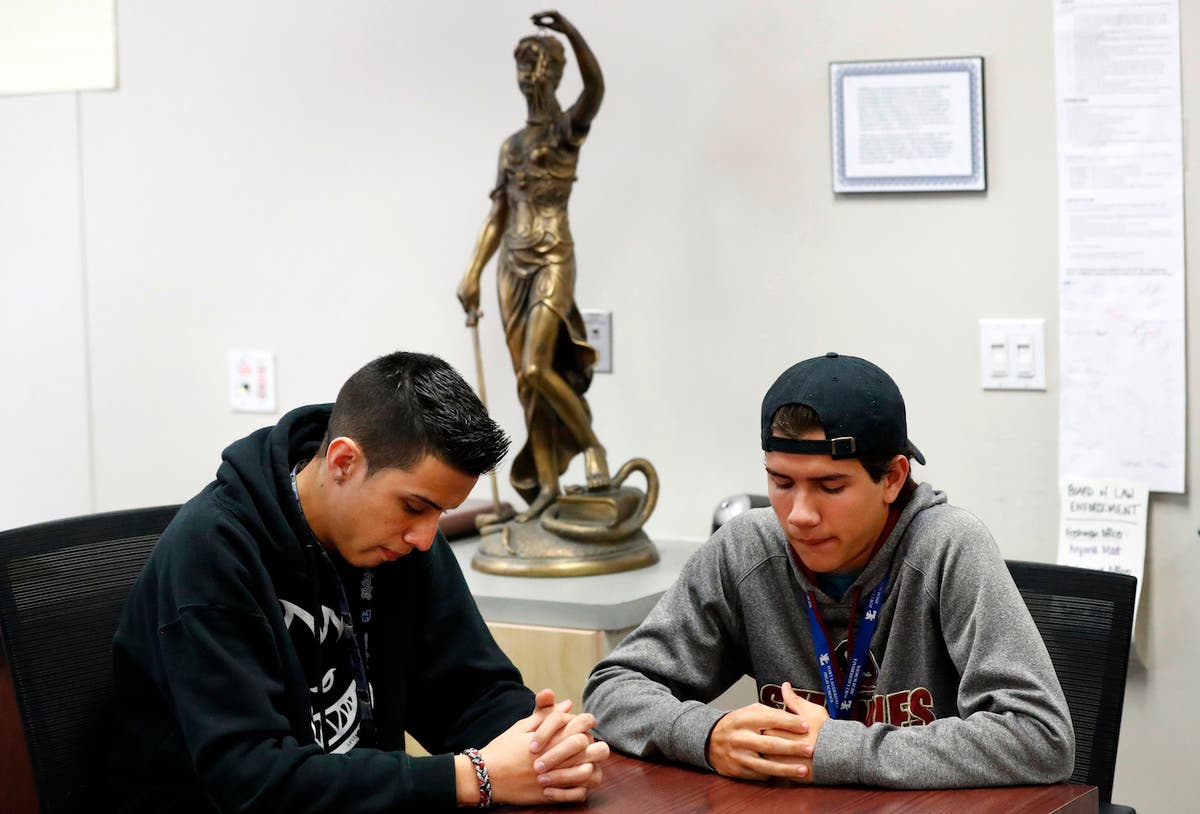 Students at Fort Lauderdale High School Fernando Davila, left, and Jake Lynch, both 17, participate in a moment of silence in their Court Proceedings class in Fort Lauderdale, Florida.