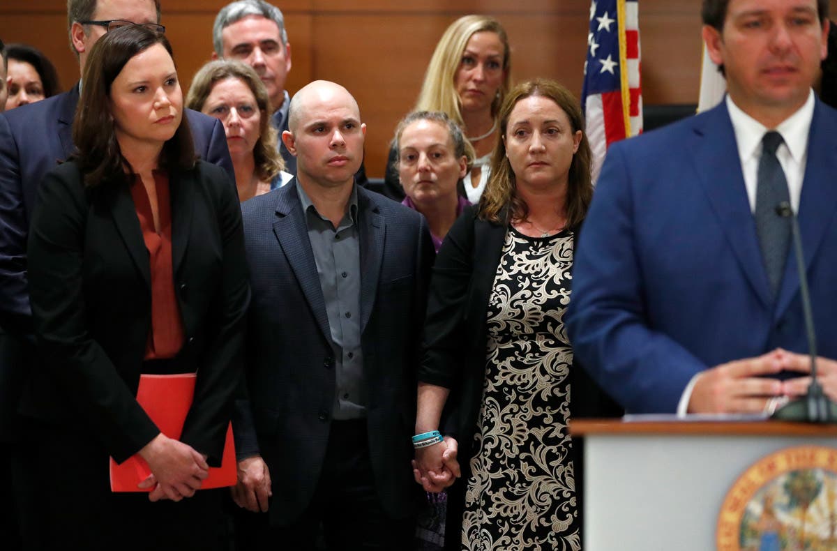 Ilan and Lori Alhadeff, center, the parents of Alyssa Alhadeff, who was killed in the Parkland School shooting hold hands as they listen to Florida governor Ron DeSantis as he speaks during a news conference, Wednesday, February 13, 2019, in Fort Lauderdale, Florida.
