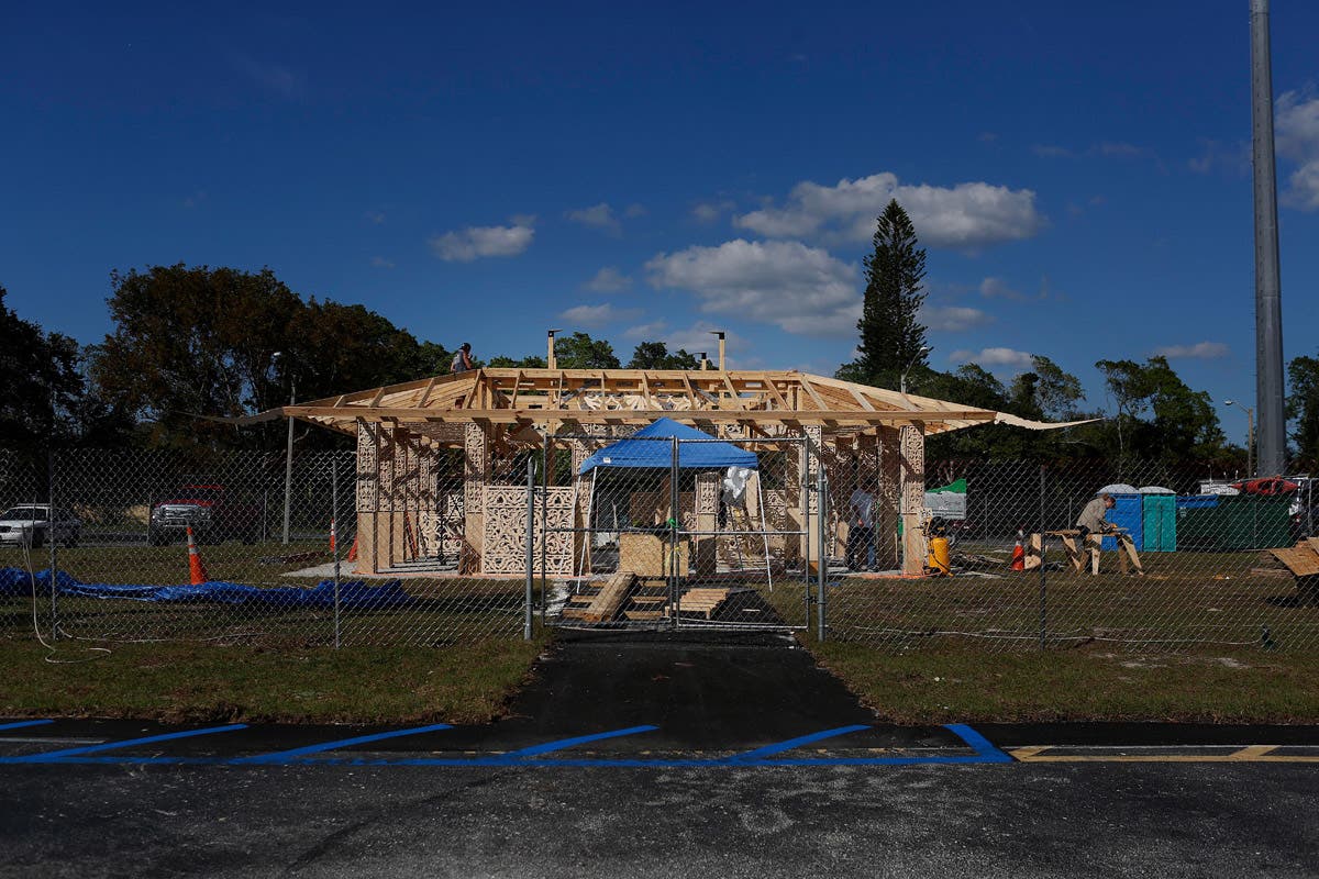 A volunteer helps build the temporary temple for the anniversary of the Marjory Stoneman Douglas High School shooting massacre.