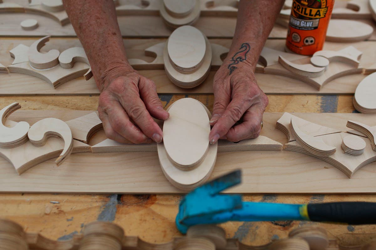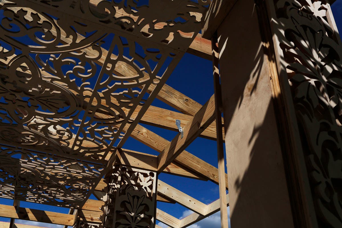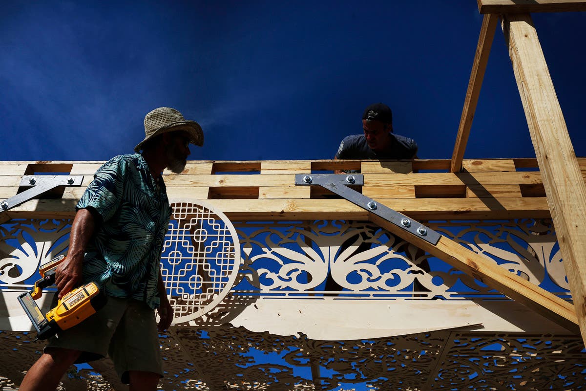 Volunteers help build a California artist, David Best's vision for a non-denominational, temporary temple for the anniversary of the Marjory Stoneman Douglas High School shooting massacre.