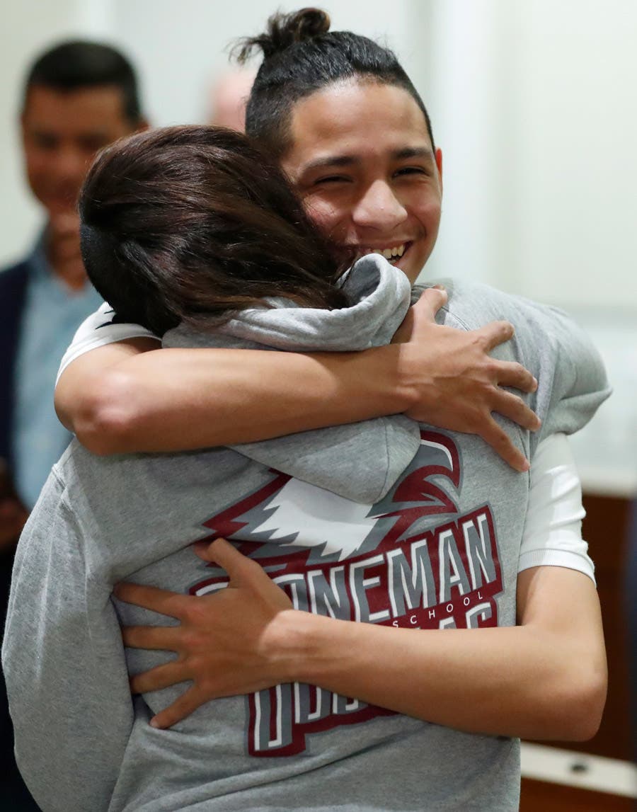 Anthony Borges, rear, who was shot during the Parkland School shooting, hugs Marianne Sheehan after a news conference with Florida governor Ron DeSantis, Wednesday, February 13, 2019, in Fort Lauderdale, Florida.