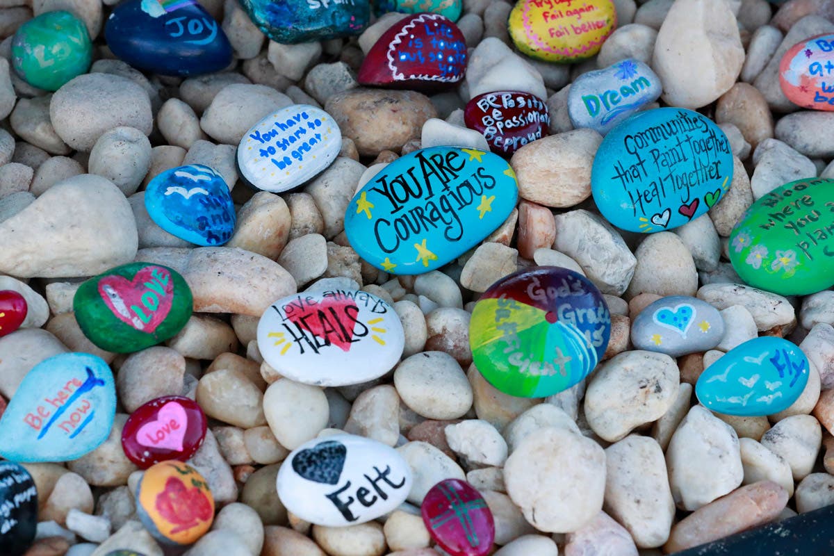 Detail is seen on the painted stones at a memorial outside Marjory Stoneman Douglas High School are shown during the one-year anniversary of the school shooting.