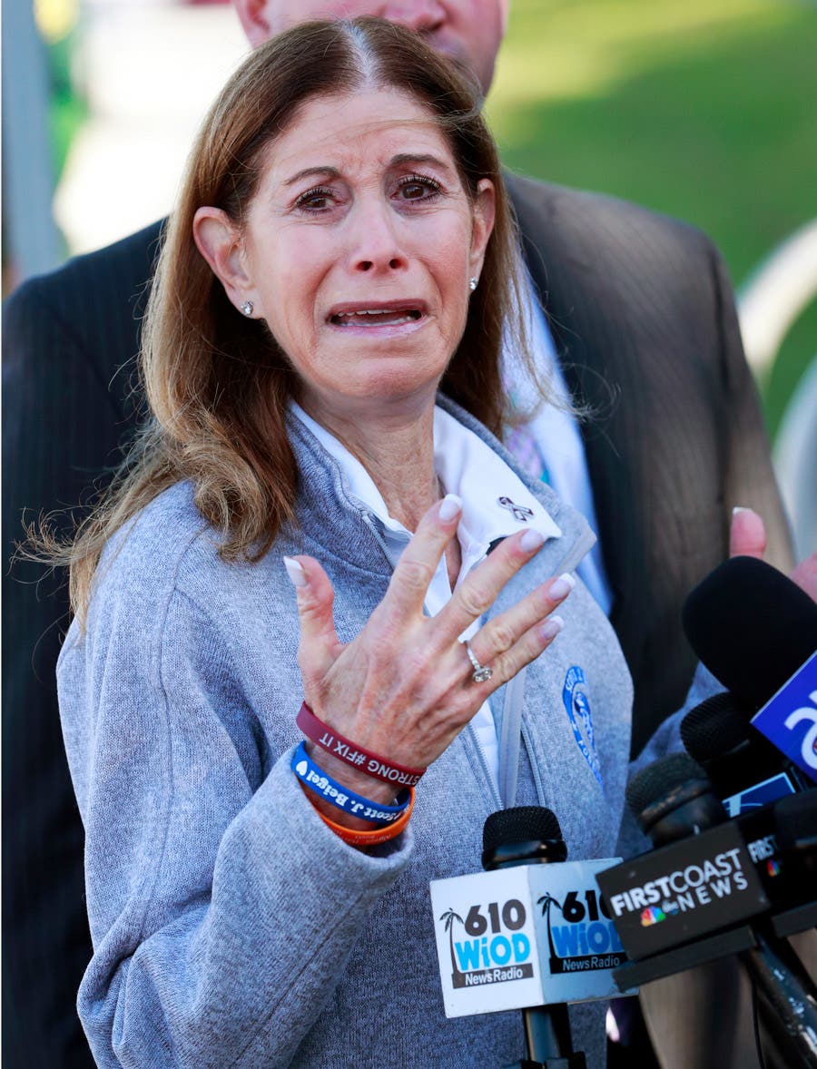 Linda Beigel Schulman, mother of Scott Beigel, a geography teacher and cross country coach who was killed during the Marjory Stoneman Douglas High School shooting last year, gestures as she speaks to members of the media during the one-year anniversary of the deadly shooting.