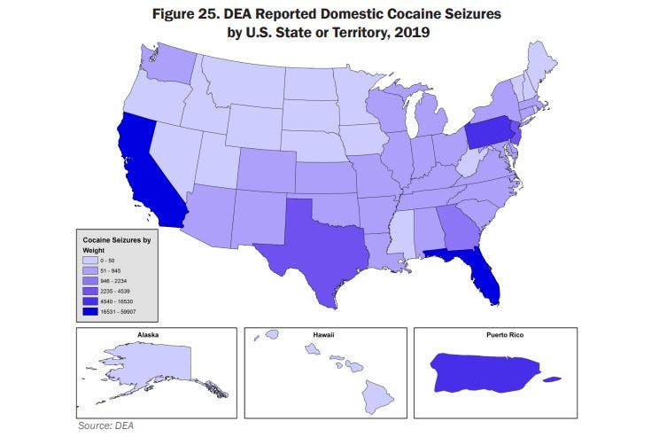 California had the second-greatest amount of cocaine seized in 2019 and Pennsylvania the third. The U.S. territory of Puerto Rico had the fourth-largest amount of cocaine seizures.