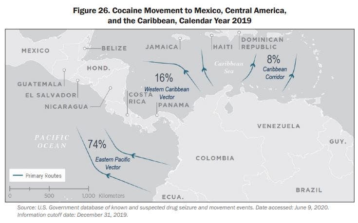 Florida’s proximity to ports with water vessels bound for the Caribbean makes it ideal for smuggling cocaine. The greatest amount of cocaine by weight seized in 2019 by the DEA was along Florida highway, high-traffic international airports and seaports.