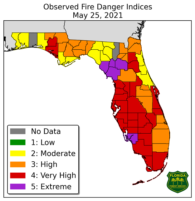 On Tuesday, a majority of counties around Florida were painted red on the Florida Forest Service Fire Danger Indices map, indicating a "very high" fire danger. Five counties were flagged for "extreme" fire danger.