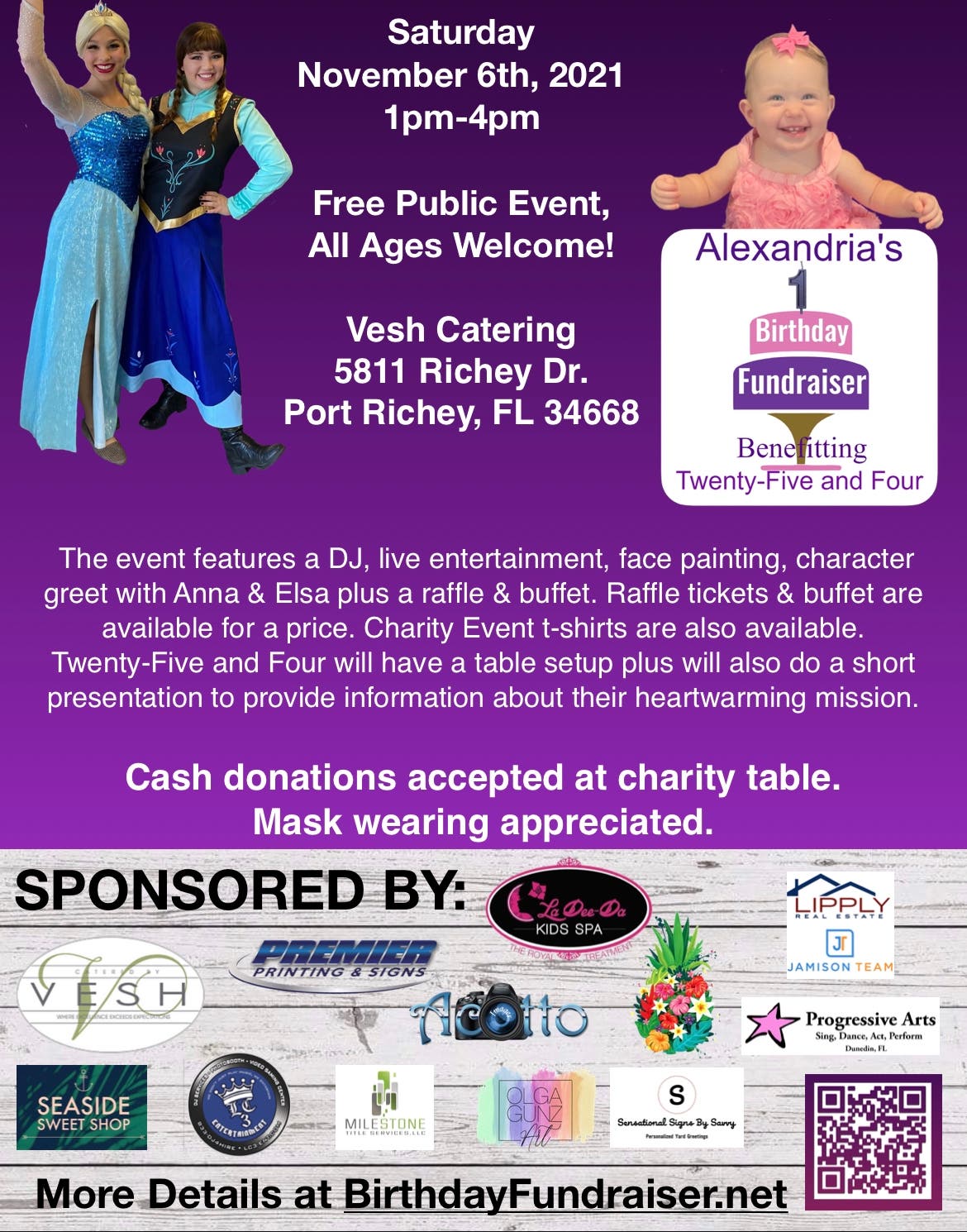 PORT RICHEY, FL —Birthday Fundraiser Inc. will host Alexandria’s First Birthday Fundraiser benefitting Twenty-Five and Four Nov. 6 from 1 to 4 p.m. at Vesh Catering, 5811 Richey Drive, Port Richey.