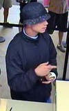 The suspect is described as a white male in his 30s. He was last seen wearing a blue floppy hat, blue shirt, blue sweatpants and had gauze around his left hand.