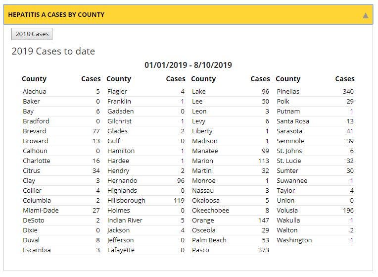 From Jan. 1, 2018, through Aug. 10, 2,740 hepatitis A cases were reported in Florida, more than double the number of cases reported in 2016-17.