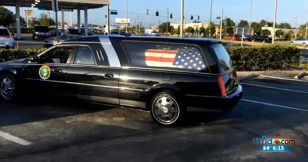 The problem was that hearse contained the flag-draped coffin of Lt. Col. Jesse Coleman, whose body was being transported from Veterans Funeral Care in Clearwater to a service in his honor. The drivers decided to make a pit stop at the New Port Richey eatery around 8:50 a.m. for coffee. Their vehicle caught the attention of a passerby who happened to take a video.