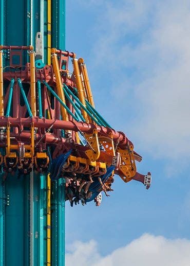 “At the ride’s highest point, like its bird of pretty namesake, riders pivot 90 degrees in midair to a face-down position. An instant later, they’ll plunge 60 mph straight down.”