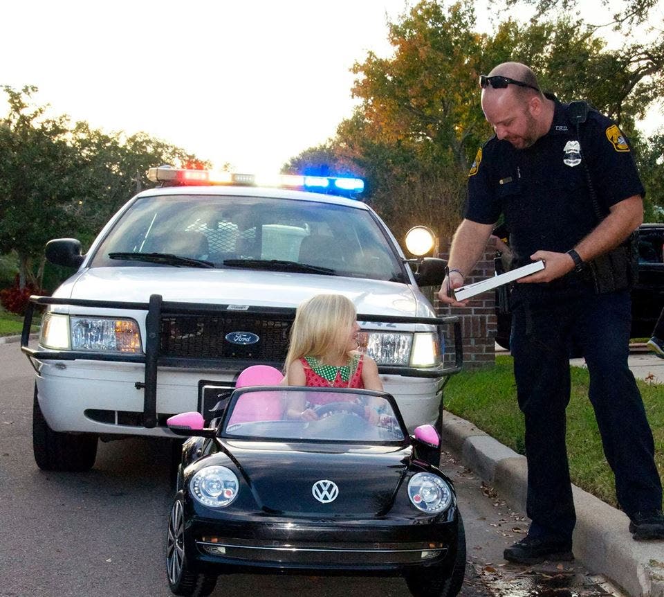 A little girl in a sleek black-and-pink Volkswagen Beetle learned a few rules of the road courtesy of a Tampa Police officer.
