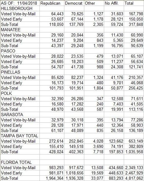 In 2016, I accurately predicted the outcome of the election, not because I am a polling genius or possess some sixth-sense intuition, but because I simply studied the early voting data in Florida and saw the Republicans rallying to victory. I also knew Florida was an important swing state and realized, as Florida goes, so goes the country. I believe this remains true in 2018. In other words, I have found the early voting data produced by the Florida Division of Elections to be much more reliable than any poll I have come across.