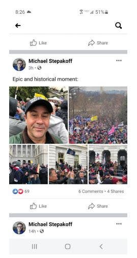 The document also includes a Jan. 6 Facebook post showing Stepakoff with Trump supporters outside the Capitol including a selfie. The caption reads, “Epic and historical moment."